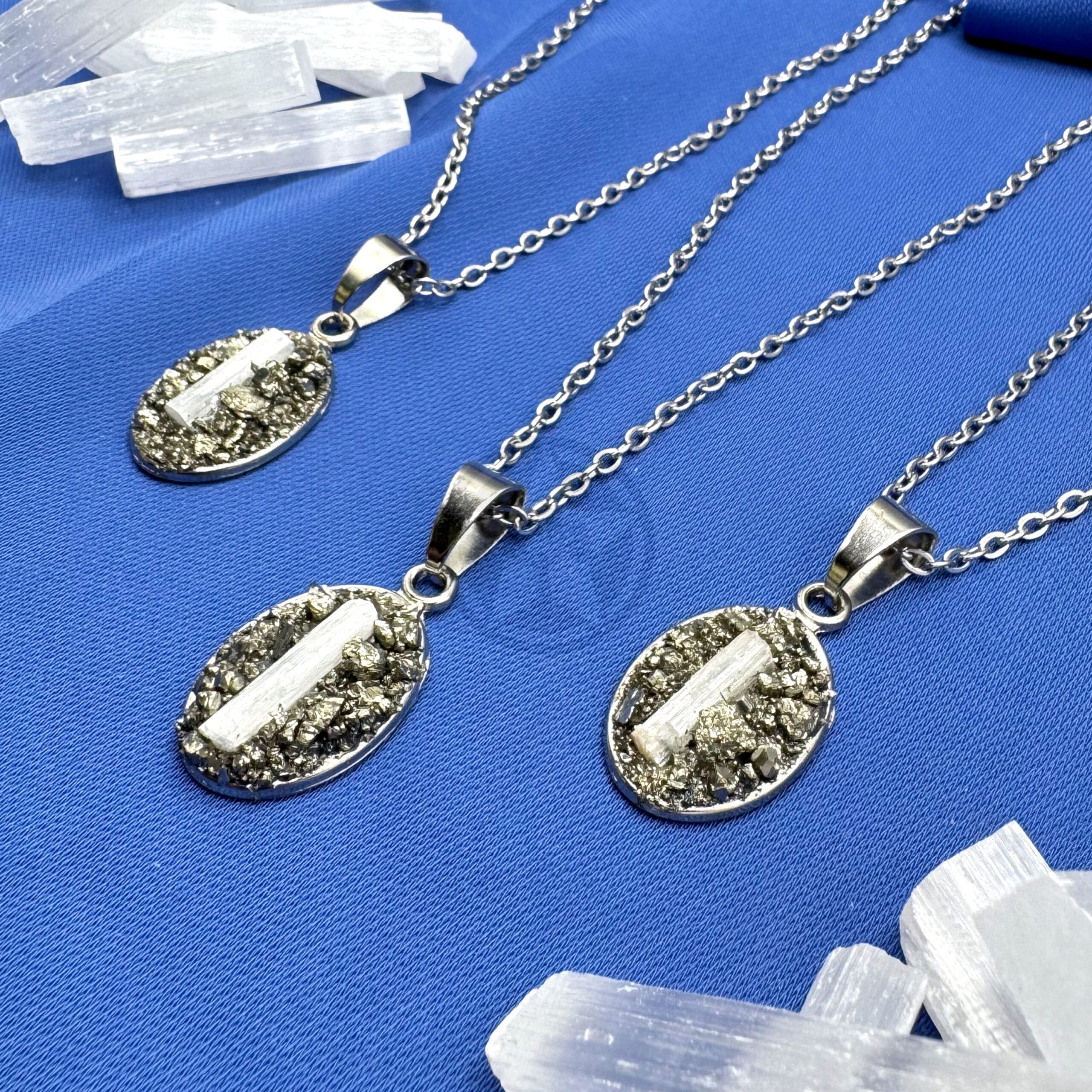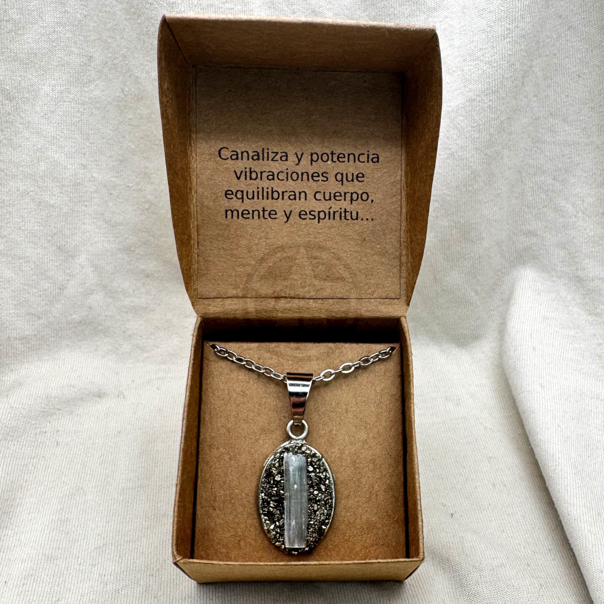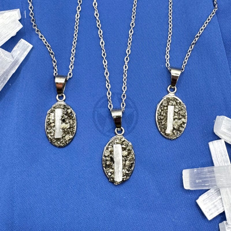 • Propiedades: La selenita es conocida como la gran estabilizadora emocional ayudando a aclarar y limpiar la energía. Combinado con la piedra de la prosperidad por excelencia, la pirita, crean un poderoso talismán que ayuda a promover la claridad mental.